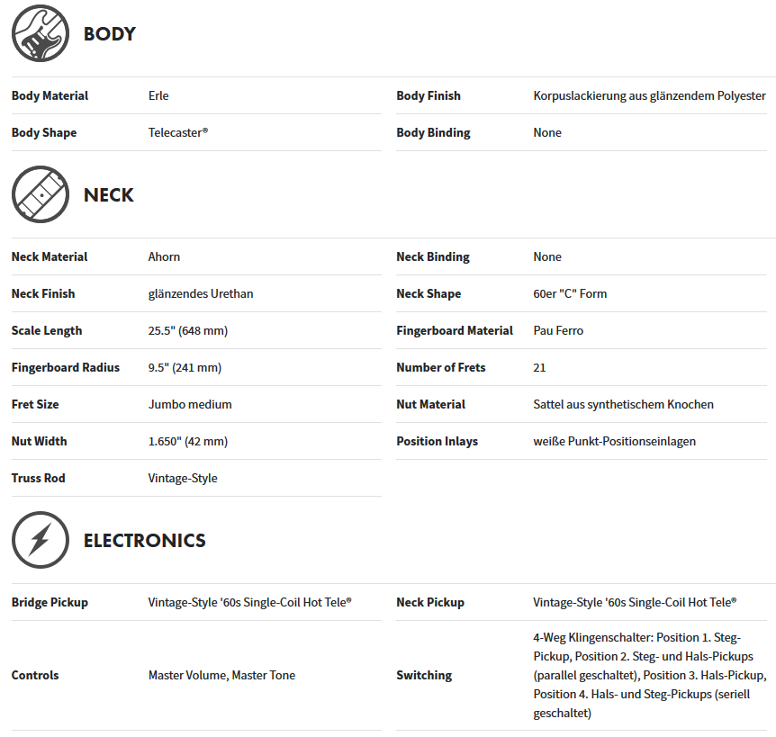 | Beschreibung: | Du liebst das Mojo vergangener Zeiten und willst gleichzeitig aktuelle Features? Dann passt die Vintera ‘60s Telecaster Modified zu dir. Sie verbindet den klassischen Look mit zeitgemäßen Details wie einem modernen Halsprofil und Griffbrettradius, heißeren Pickups und neuer Elektronik. Bei dieser Gitarre steckt jede Menge Power unter der Haube! |
