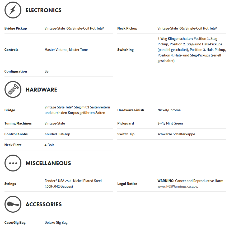 | Modell | Fender Tele Vintera 60`s Lake Placid Blue, Pau Ferro |