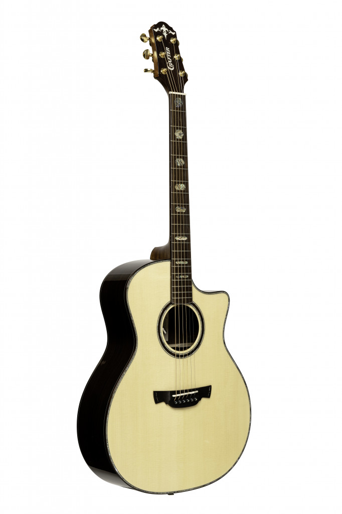 Beschreibung des ArtikelsStage Premium Serie 36, cutaway Grand Auditorium akustisch-elektrische, massiver Fichtendecke- Decke: Engelmannfichte, massiv- Boden und Zargen: Palisander, massiv, mit Streifen am Boden- Zargen: Palisander, laminiert- Hals: Mahagoni- Sattelbreite: 42 mm- Griffbrett: Palisander, Abalone Hexagon Einlagen- Steg: Palisander- Sattel: Kompensiert- Rosette: Abalone- und Palisander Einlagen- Korpus-Binding: Palisander mit Abalone-Purfling- Elektronik: DS-2 Preamp-System mit Profi Tonabnehmer im Schallloch und Untersattel-Tonabnehmer- Mechaniken: Grover, Gold- Saiten: D'Addario EXP16, Stärke .012 - .053- Finish: Hochglanz- Inkludiert: Gigbag- Farbe: Natur