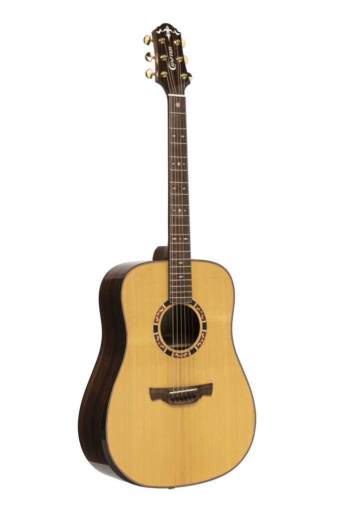 VL Serie 22, Dreadnought akustisch-elektrisch mit massiver VVS Fichtendecke- Decke: Engelmannfichte, massiv, mit Vintage Voicing System behandelt- Boden und Zargen: Makassar-Ebenholz-Lagen- Armstütze: Palisander - Hals: Mahagoni, mit Holz-Binding - Griffbrett: Palisander, Schneeflocken-Holzeinlagen - Steg: Palisander - Sattel: Kompensiert, Tust - Rosette: Crafter-Holzeinlage- Kopfplattenlogo und -einlage: Perlmutt - Korpus-Binding: Palisander mit Paduk-Purfling- Elektronik: DS-2 Preampsystem, im Schallloch montierter Pro-Tonabnehmer und Untersattel-Tonabnehmer- Mechaniken: Grover, Gold - Saiten: Elixir, Stärke .012 - .053 - Finish: Hochglanz- Im Lieferumfang enthalten, MG Linebag, Beige- Farbe: Natur